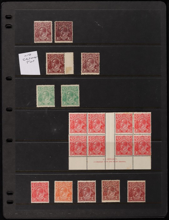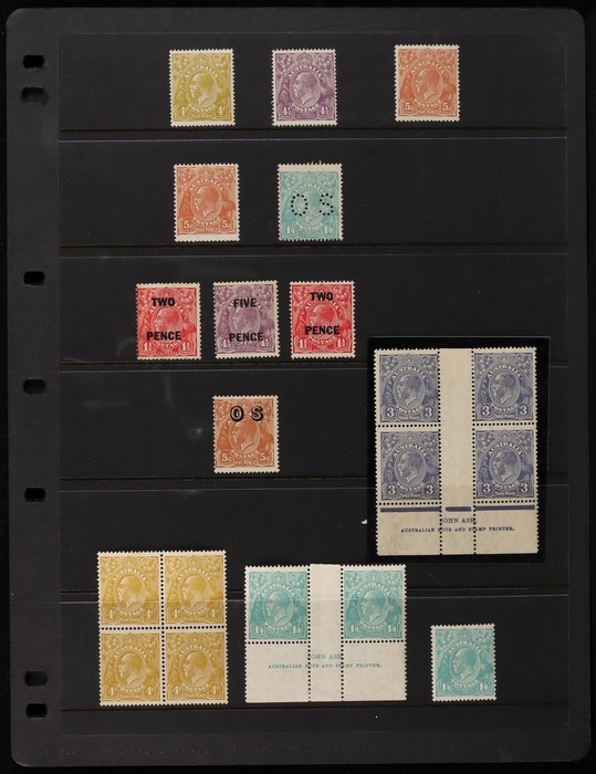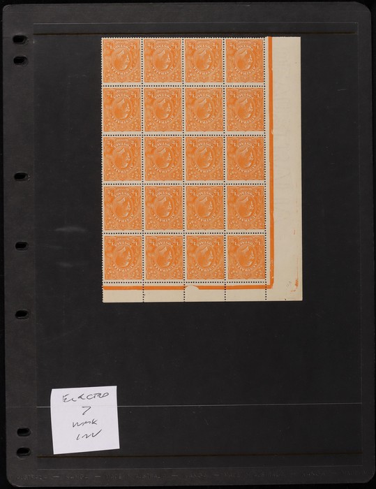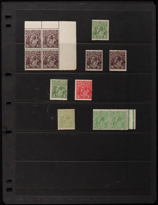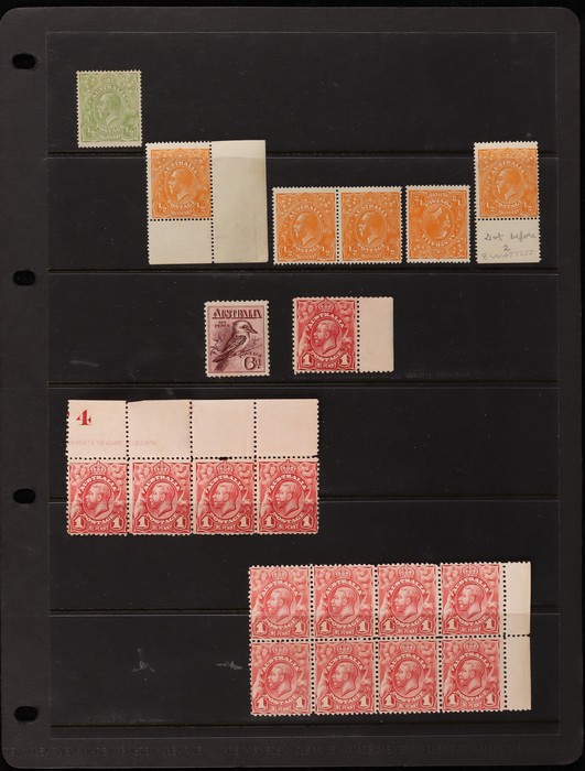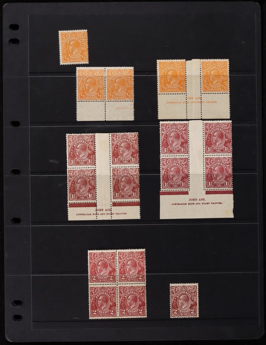 1/4 CofA wmk Ash imprint pr, 1d red Engraved blk of 8 & plate 4 part imprint strip of 4, 6d maroon Kookaburra. Approx 60% F-VF MLH, 40% F-VF MNH. SG cat £3000+ = A$6000. ACSC cat $8000+. (220+) (Image1) (Image2)