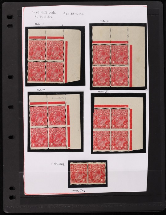 line perf, 1/4 single wmk shades (3), 1½d brown SM wmk plate 1 & 3 Ash imprint blks of 4, 1½d red SM wmk perf 13½x12½ plates 1-4, 2d red-brown SM wmk perf 14 blk of 4, plate dot blks, 3d blue CofA wmk Ash imprint blk of 4,