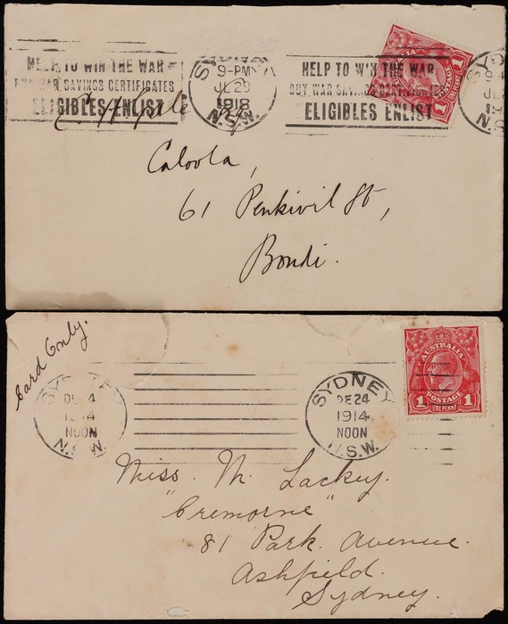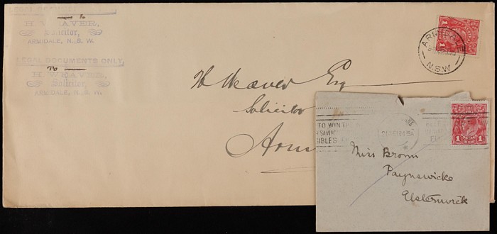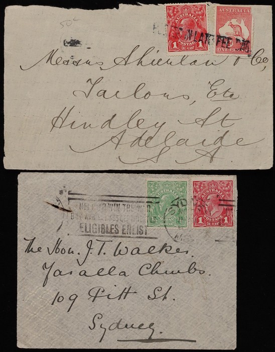 1d red shades covers. Noted carmine-red (G10) Die II, dated DE 12 1914 & JL 29, 1918 cover with slogan 'Help To Win The War' & 'Armidale 26 FE 15' cover to local solicitor. Mostly G-VF. (6) (Image1) (Image2)