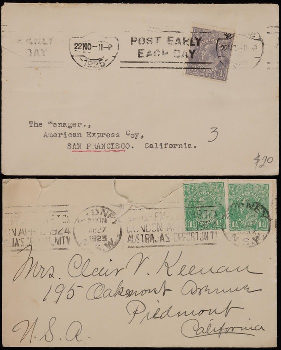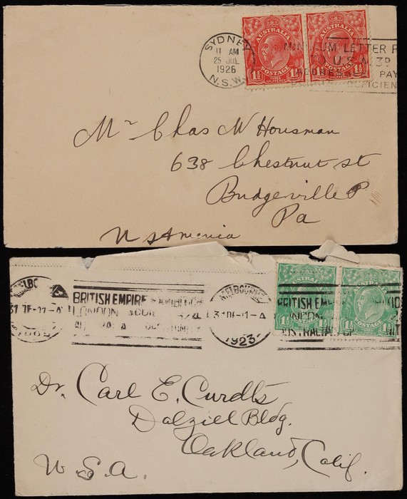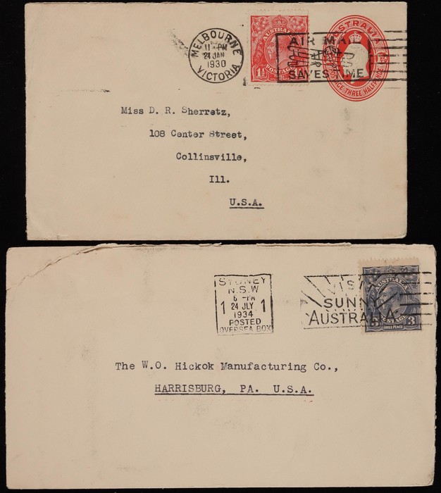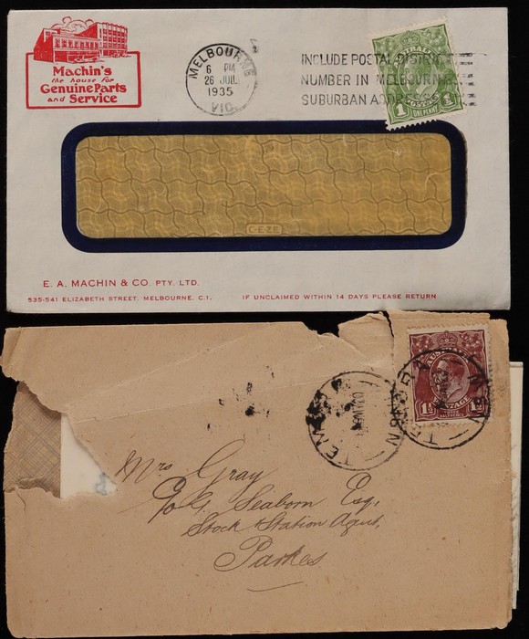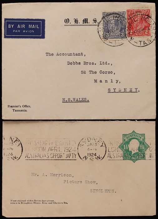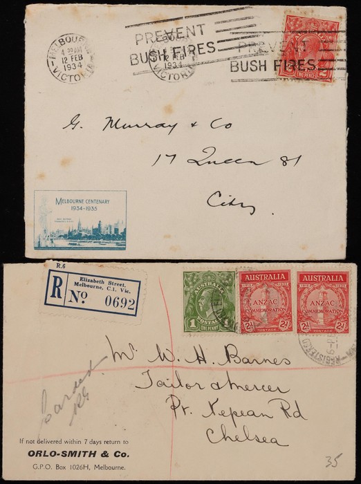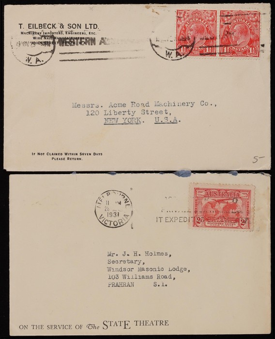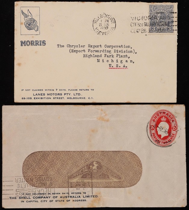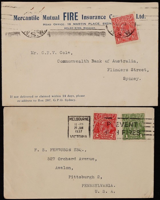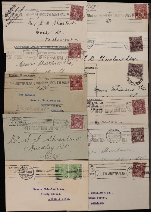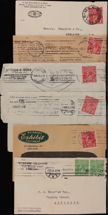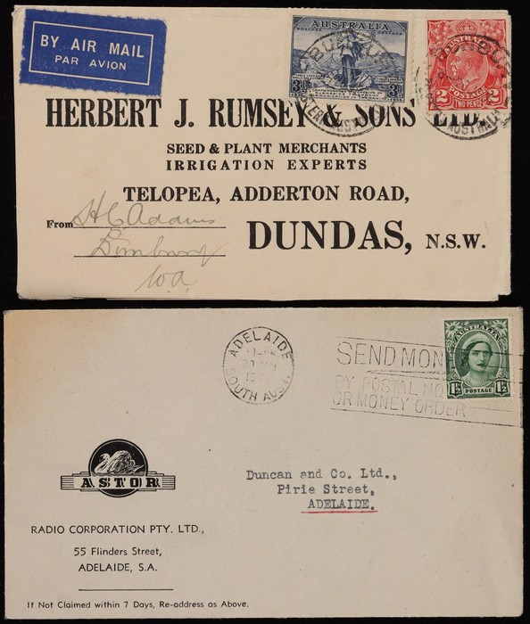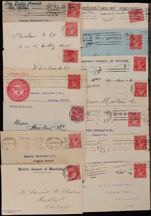 KGV covers mainly advertising with many KGV values 1½d-3d & others to Hermes 1/6d. Noted Orlo Smith, Lanes Motors (Morris), State Theatre, Astor Radio Corporation etc. Mostly G-VF. (13) (Image1) (Image2)