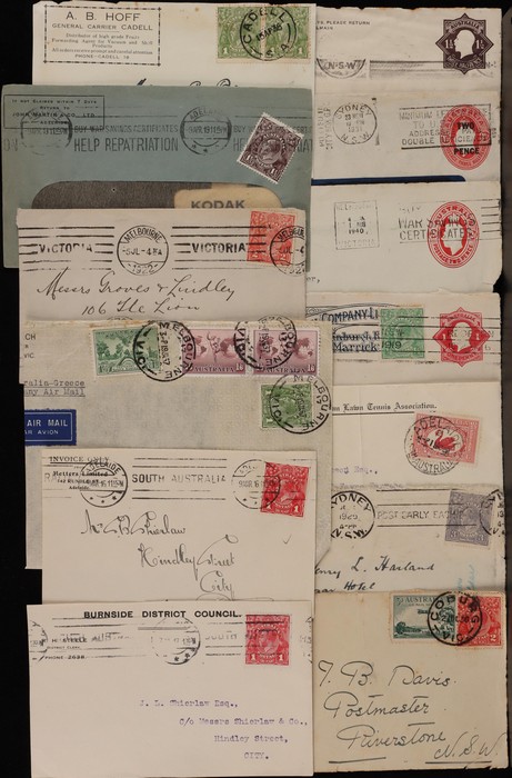 KGV cover fronts, inc Shierlaw 1d KGV red x16, 1½d KGV black-brown x10, various others inc 1d red Die 2 (2), 1 mixed franking with 1d Kangaroo tied 'POSTED IN LATE FEE BAG'. Noted 1d red shades, various advertising etc. Interesting lot. (48) (Image1) (Image2)