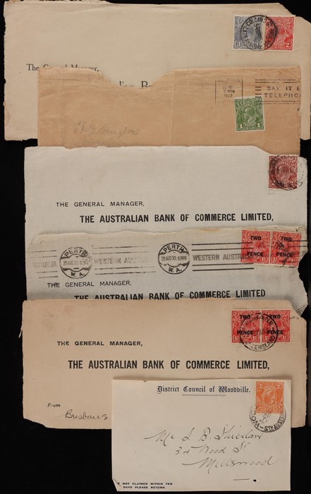 inc 1920 Mourning cover with 1½d chocolate-brown KGV showing variety 'major damage to LR cnr' (plated 5AL6) cds Gundagai JA 20, 2 Perth 1929 unclaimed OHMS covers with 1½d & 3d KGV with various unclaimed markings, 1928 Aerial Mail