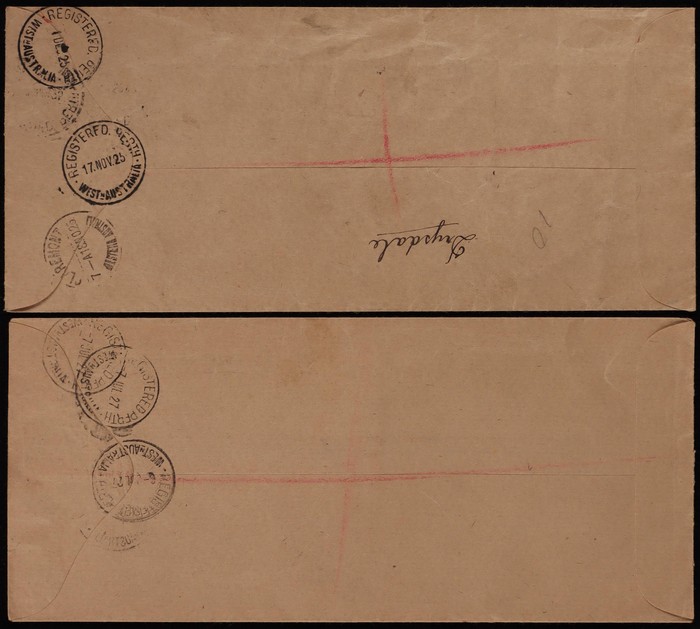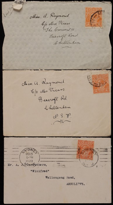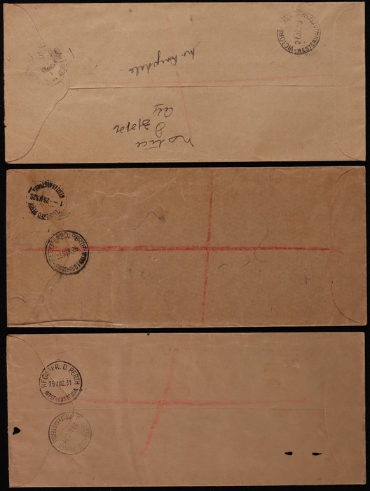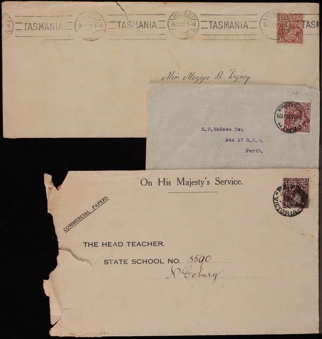 orange-brown SM wmk perf 13½x12½ (ACSC 126Ab) dated 24 AUG 31. From Perth, various transit b/s, Unknown To Letter Carrier, Not Known. etc. VF fresh. ACSC cat $375. (3) (Image1) (Image2)