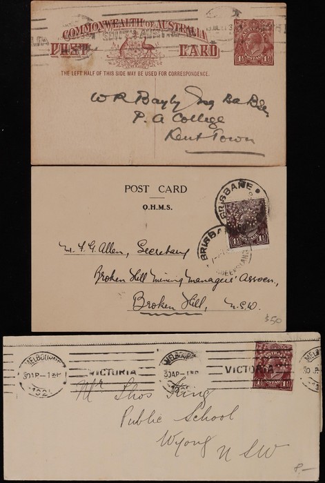 covers/postcards with KGV 1½d black & brown shades, noted OHMS cover to Head Teacher at North Coburg with Young Members Patriotic Guild contributions card inside, postcard from Govt Printing Office to BHP confirming order for various award
