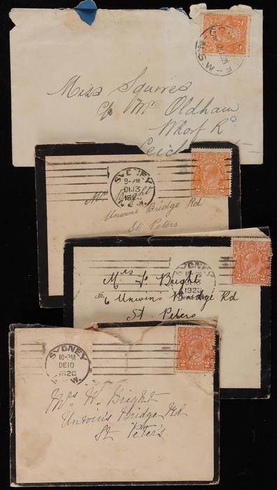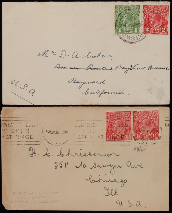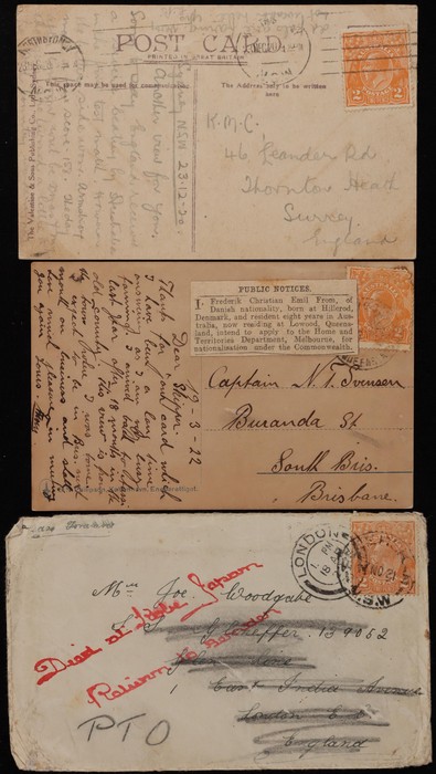 covers/postcards with KGV 2d orange, noted an interesting postcard with public notice of intention to apply for Aust citizenship. Several bereavement covers. Generally G-VF. ACSC cat on cover is $20 x 13 = $260 as cheapest. (13) (Image1) (Image2)