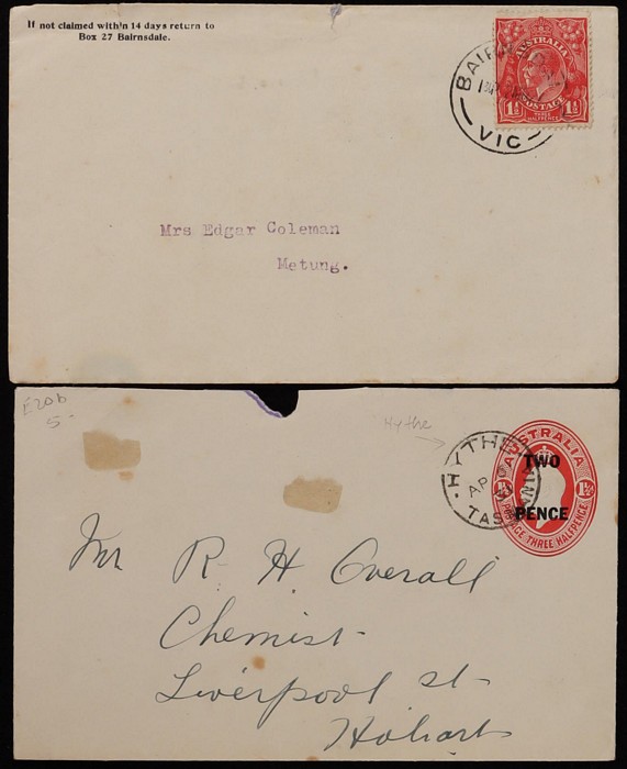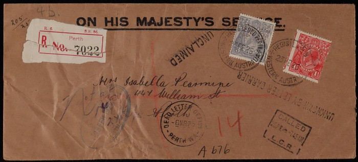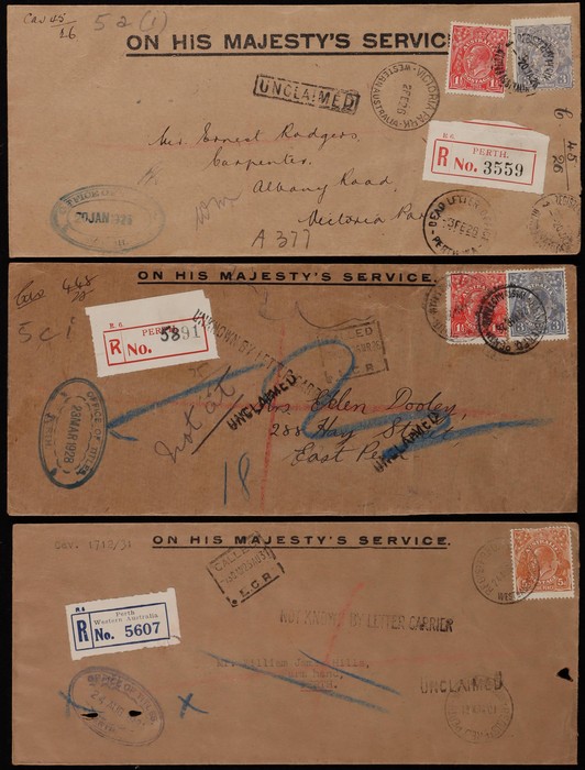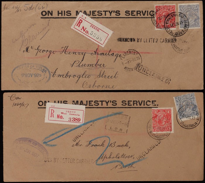 Registered Unclaimed covers with KGV perf OS 1½d red S wmk with misplaced perfs (ACSC 89Aba) & 3d pale dull violet-blue S wmk Dry Ink (ACSC 104BC). From Perth, various markings unknown by letter carrier, dead letter office etc. Both varieties
