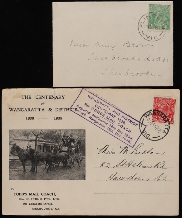 KGV covers with values 1½d-3d. Noted 1936 TAS Premiers Office, US Dept of Commerce, Oddfellows Advertising cover & 1938 Wangaratta Centenary illustrated cover sent by Cobb & Co Coach. Several have contents inc superb fresh 2 page letter on