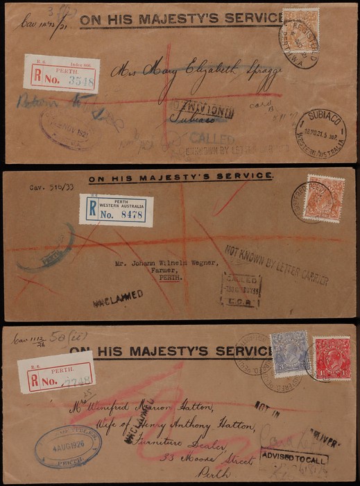 OHMS Registered Unclaimed covers with KGV perf OS 1½d red single wmk (ACSC 89Abb) & 3d blue single wmk (ACSC 104Bba) dated 20 JAN 26, 1½d red single wmk (ACSC 89Abb) & 3d blue SM wmk perf 14 (ACSC 106Aba) dated 23 MAR 28, 5d