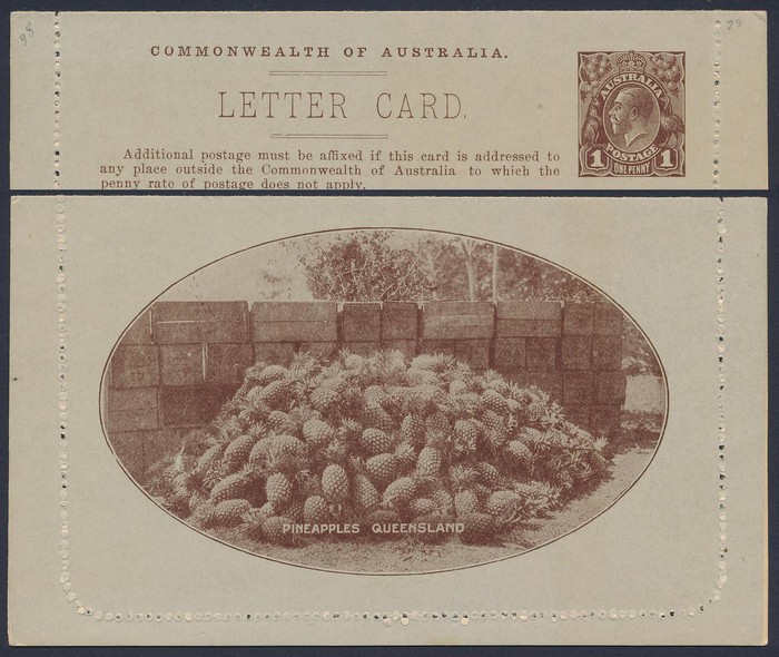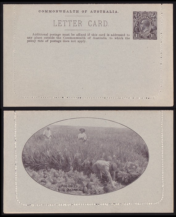 KGV 1½d brown-black, perf 10, mottled stock, view Pineapples Queensland (pickers). Superb fresh UN. ACSC LC41(102B) cat $200. Scarce so nice. (Image1)
