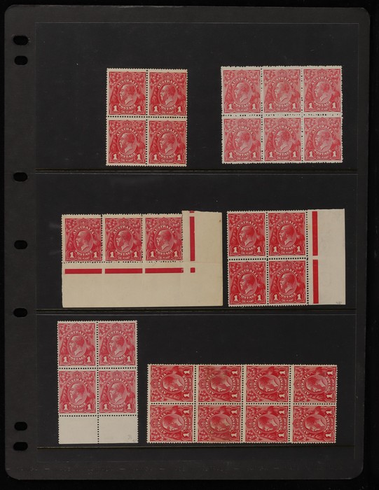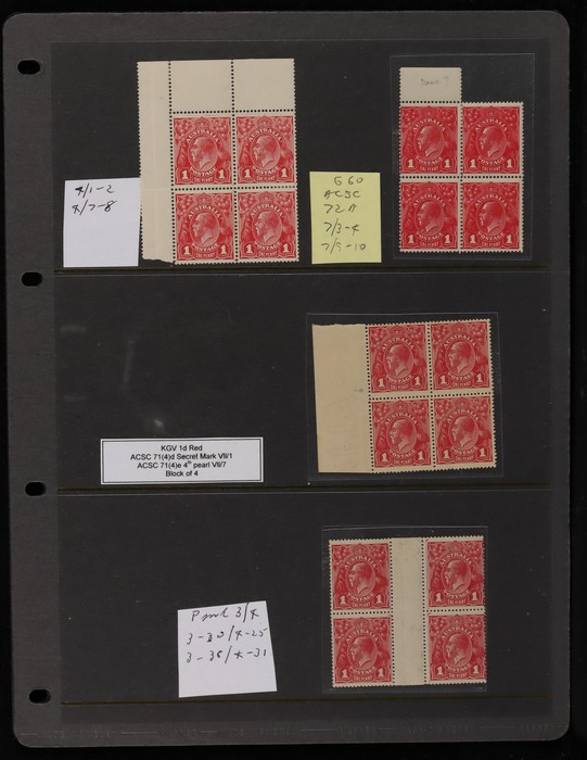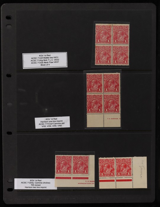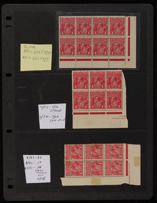 (8/54) & 'run N' (8/60), part Harrison imprint blk with 'ferns' (7/54) & 'RA join' (7/60), part Harrison imprint blk of 6 with 'kangaroo's tongue out' (8/56), other blks plated & not plated. Odd faults, generally G-F MLH/MNH. SG 21(var). ACSC 71(var)