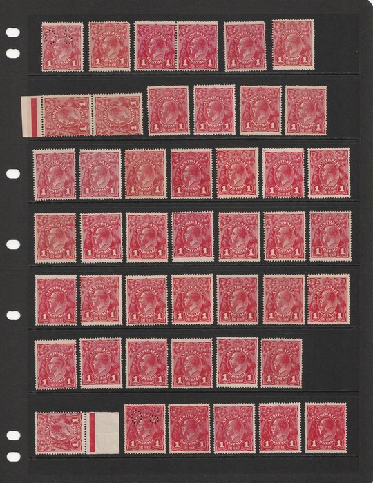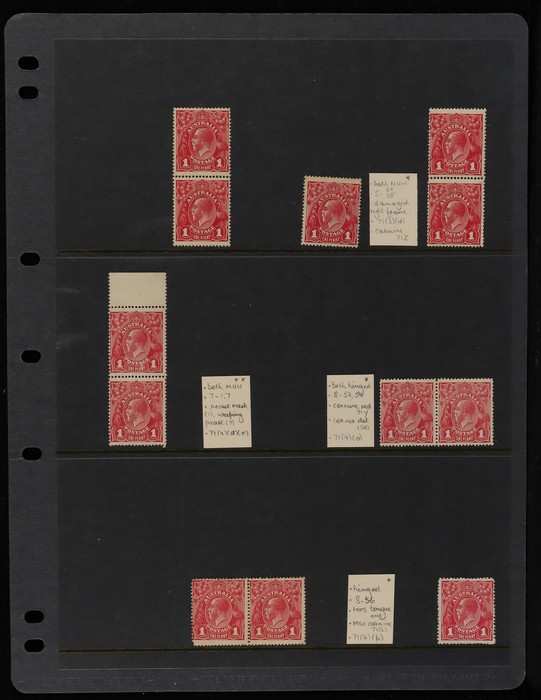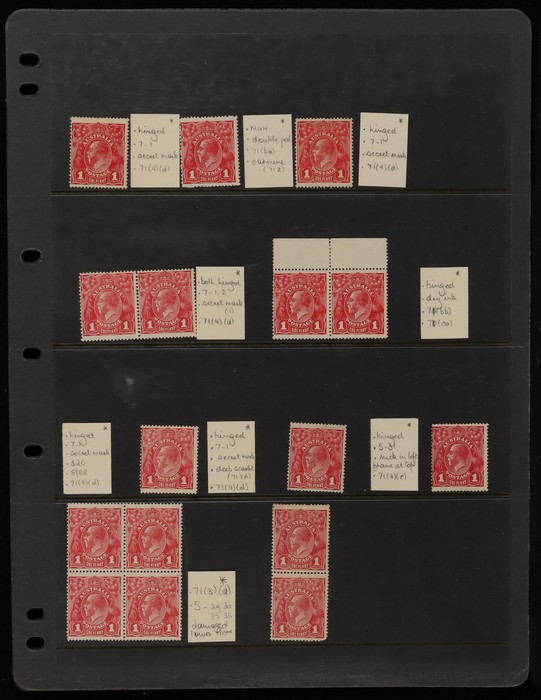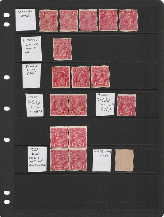 collection of varieties on hagners inc 'break left frame' (5/31), 'dot before 1' (6/21), 'secret mark' (7/1), 'weeping pearl' (7/7), 'wattle line' (7/31), 'corner dot' (8/54), 'kangaroo's tongue out' (8/56) etc, some in prs & blks, range of shades,