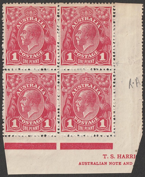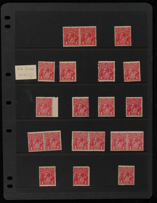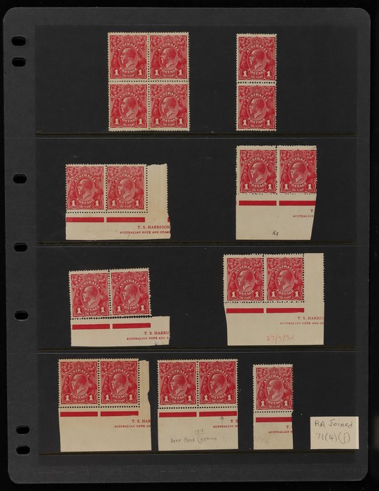 on hagners of major variety 'RA joined' in singles, prs, blks of 4 & part imprint prs (6), a few with variety 'ferns'. There are a total of 25 'RA join' in mainly smooth paper shades inc G33 carmine (aniline), also noted G63 rose-red. Unusual