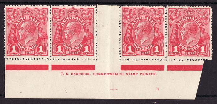 (G31) Harrison one line imprint strip of 4 positions 7/59, 7/60 (RA Join), 8/55, 8/56 (Roo tongue out). Fine MLH/MNH, rounded cnr. SG 21(var), ACSC 71Y(4)zj cat $1800 as blk of 4. (4). (P) (Image1)