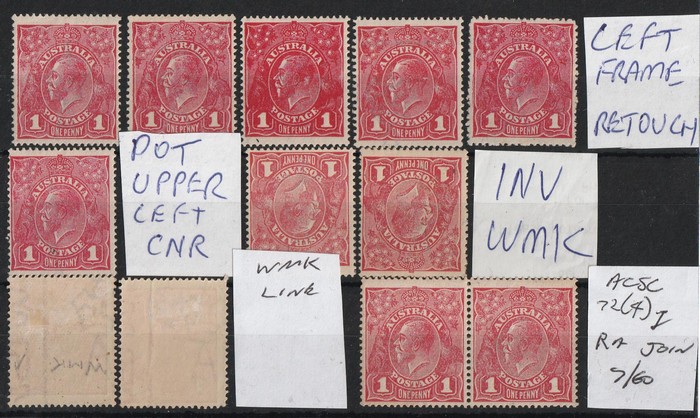 selection (G60-63) with minor varieties, major variety pr RA joined (7/60), inverted wmks (20), part marginal wmk (2). Generally fresh F-VF MLH. SG 47(var). ACSC 72 est cat $800. (12). (Image1)