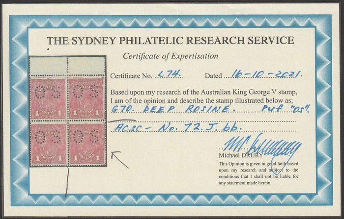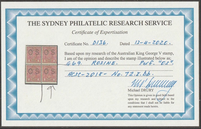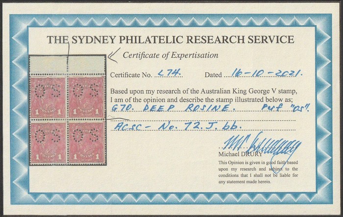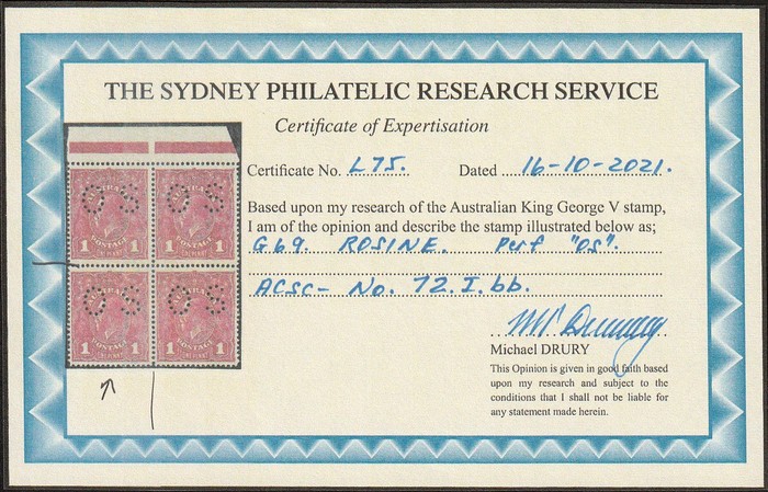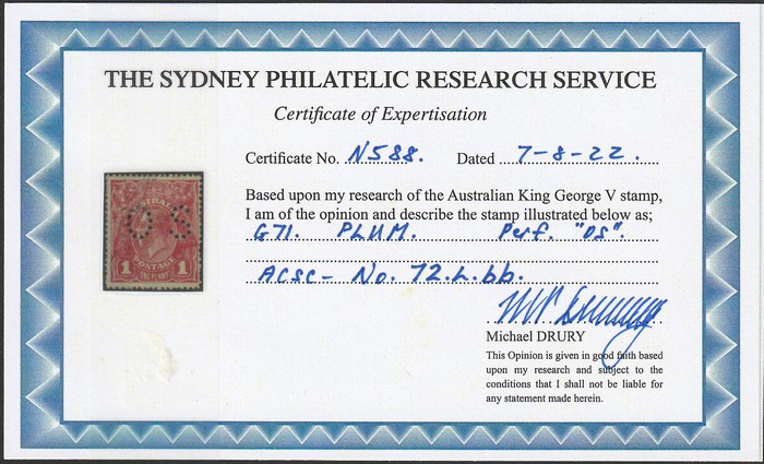 rough paper, perf OS. VF fresh MLH. SG O54c cat £140. ACSC 72Ibb cat $350. Copy of 2021 Drury photo cert for blk it came from. (P) (Image1) (Image2)