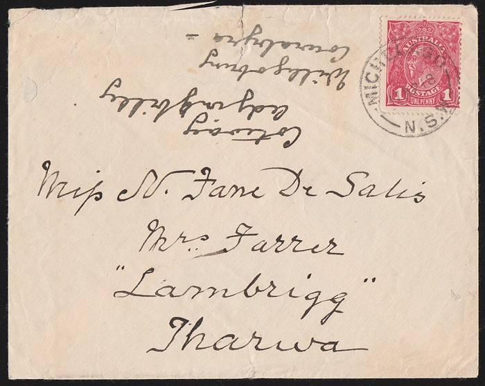 (G70) Die II on cover Michelago to Tharwa (now a suburb in ACT) dated 17 April 1918. Stamp has perf flts & envelope roughly opened. Michelago pmk is A1. Sent to a remote country property, rare item & usage. ACSC 72Ji cat Die I on cover $800, Die II