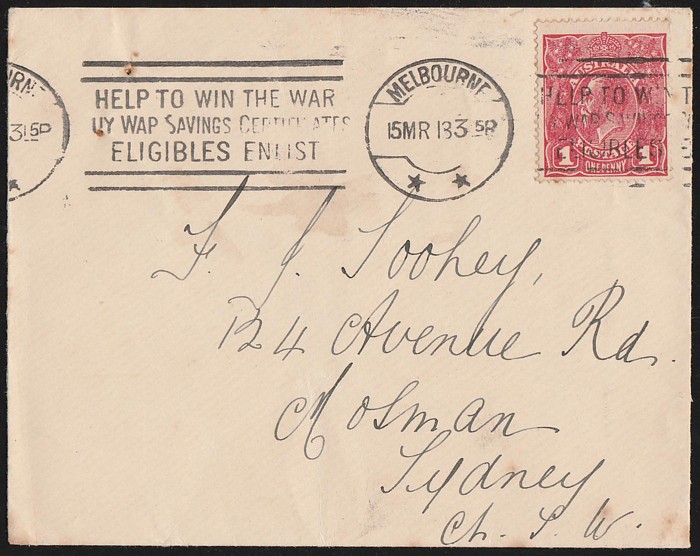 cover, stamp tied by 'Melbourne 15 MR 18 Help to Win the War etc' slogan cancel on cover (minor pinholes UL well clear of stamp) to Mosman. ACSC 72L cat $1250, plus huge premium for such an early date. Very early usage as ACSC only indicates use from
