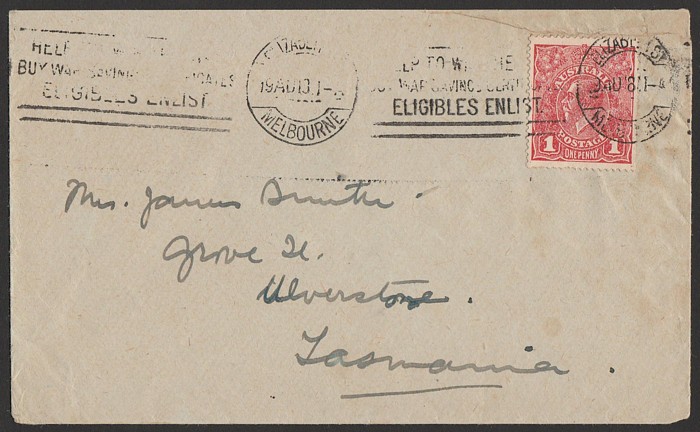 with 'thin G' variety (4/40) on cover tied by Elizabeth St Melbourne slogan cancel dated 19 August 1918, to Ulverstone Tasmania. Cover fine, stamp nibbed perf. ACSC 72M cat $200. G72 on cover is cat $50 & 'thin G' is $150 as single. (Image1) (Image2)