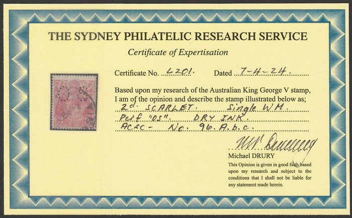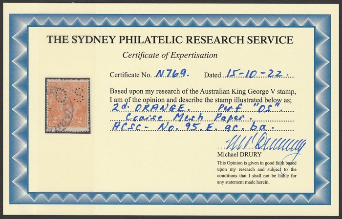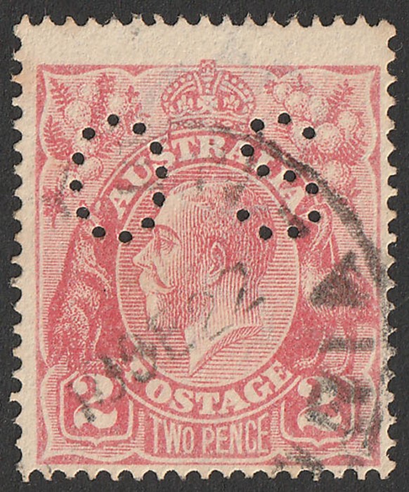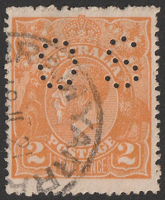 coarse mesh paper perf OS. Unusually W/C. VFU. SG O71(var), ACSC 95Eac/ba cat $400 for perfin. 2024 Drury photo-cert. (P) (Image1) (Image2)