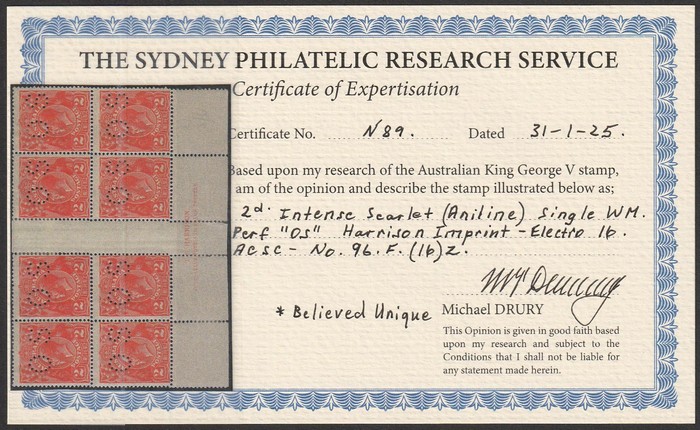(aniline) perf OS Electro 16 Harrison imprint blk of 8. Superb fresh colour F-VF 4 MNH/4MLH. SG O72(var). ACSC 96F(16)z cat $19,000++ as singles, plus should be at least +50% premium imprint blk so est $28,500. This is an extremely rare shade, priced