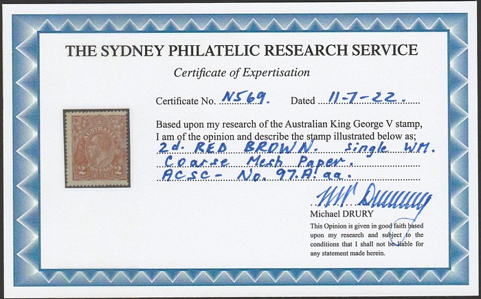 mesh paper. F MLH. SG 78(var), ACSC 97Aaa cat $400. 2022 Drury photo cert. (P) (Image1)