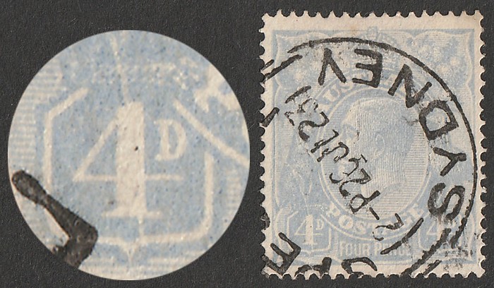 variety 'flaw 2nd lowest left wattle & spot above FO of FOUR' (2R59). VFU. SG 65(var), ACSC 112A(2)vf cat $90. (P) (Image1)