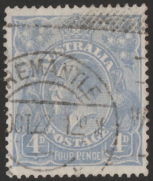 'thin Four Pence' (pos 2R12). FU, pmk 'Fremantle' clear of variety. SG65a cat £170, ACSC 112C(2)ra cat $450. (Image1) (Image2)