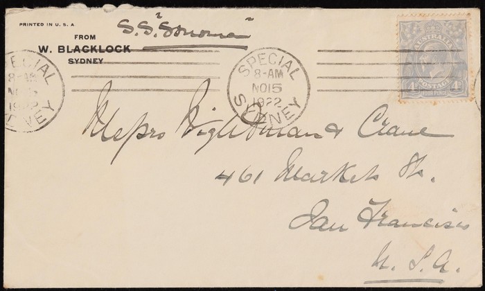 4d dull blue (perf tones) tied by 'Special Sydney NO 15 1922' pmk by 'SS Sonoma' to San Francisco. SG 65b cat £15 & 'from x5' on cover. ACSC 112C cat $125+ on cover.