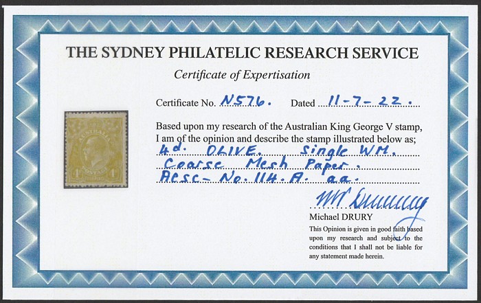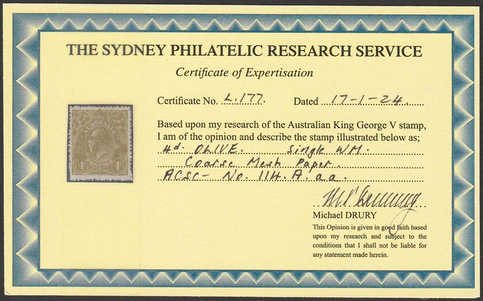 mesh paper. F MLH. SG 80(var), ACSC 114Aaa cat $375. 2022 Drury photo cert. (P) (Image1)
