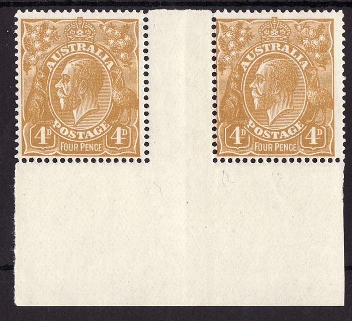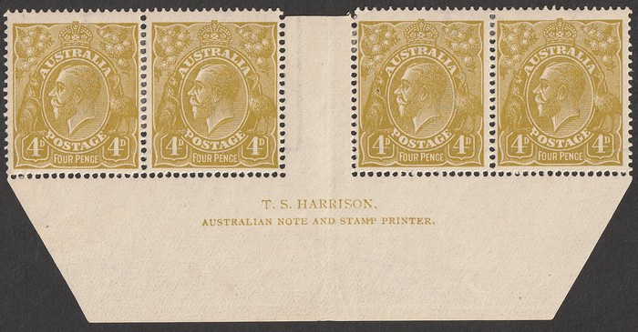 imprint strip of 4. VF MLH, evenly tropicalised gum, nice appearance. SG 80(var). ACSC 114Az cat $750 for blk of 4. (4) (Image1)
