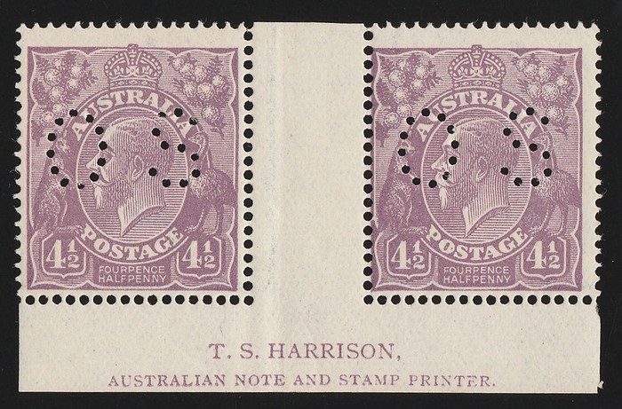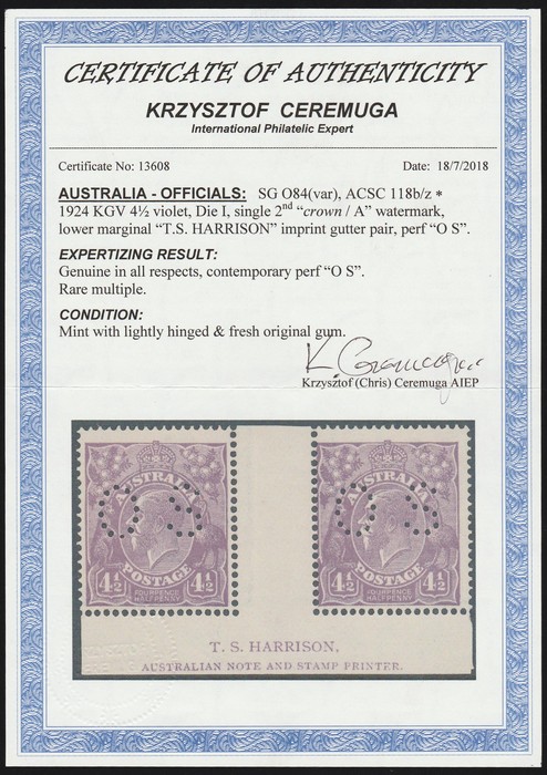 perf OS Harrison imprint pr, inc variety 'break in left frame of right stamp'. VF fresh MLH. SG O84(var) cat £650++ as singles. ACSC 118Abzb cat $900 as normals while perf OS cat x11 for singles, so $7400+ for OS imprint pr! Extremely rare &