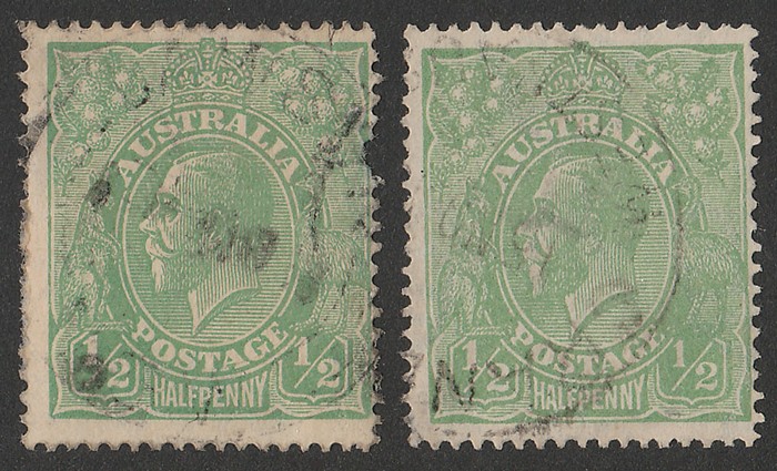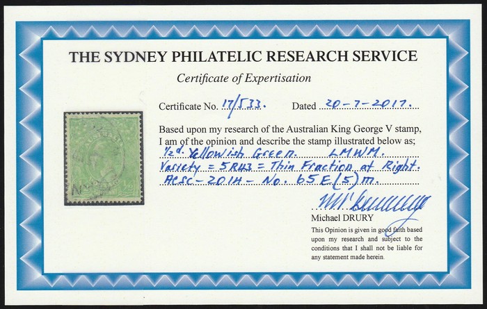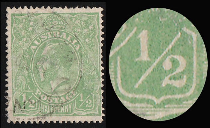 Yellowish-green variety THIN FRACTION at right (pos 5R43). Superb U, lightly cancelled. SG 48a cat £140+. ACSC 65E(5)s cat $250+. with normal for comparison. 2017 Drury photo cert. (P) (Image1) (Image2)