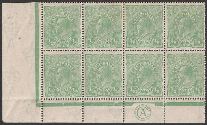 green, cnr blk of 8, CA substituted for JBC Monogram, electro 4, inc listed variety 'white flaw in right side of crown' (pos 4L56). VF M/MNH. ACSC 65C(4)o/zd cat $1100. (8) (P)