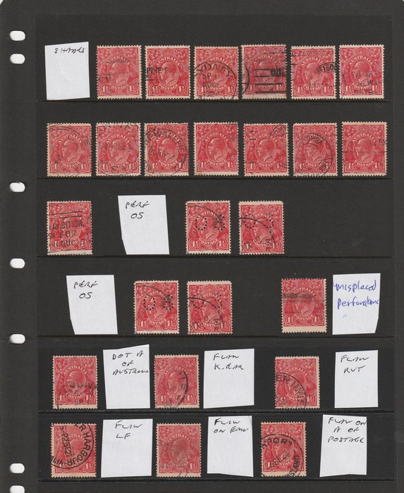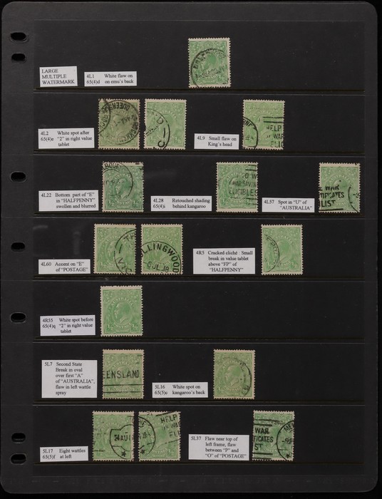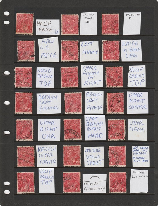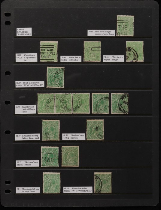 (5L16), 'thin fraction' (5R43), 'handless & neckless emu' (6L52-53), 'SW cnr broken' (7L44) etc. Mostly GU-VFU. SG 48(var). ACSC 65(var) cat $2300+. (95+) (Image1) (Image2)