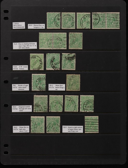 selection inc shades, 8 listed varieties 'flaw kangaroo's head' (17R1), 'scratched electro' (17R3), 'spot over S, King's head etc' (17R48), 'broken TF' (18L25), 'flaw RVT' (18R60). Mainly fresh F-VF MLH, few F-VF MNH. SG 84(var). ACSC 90A est cat