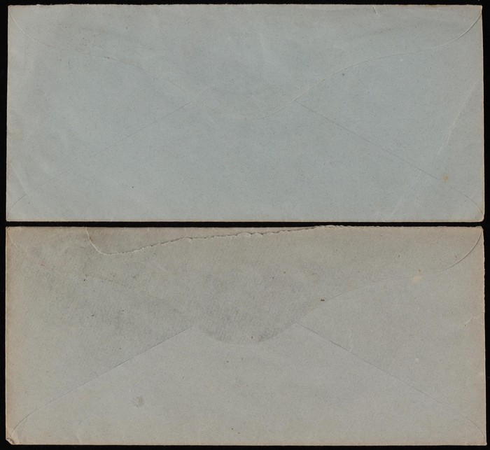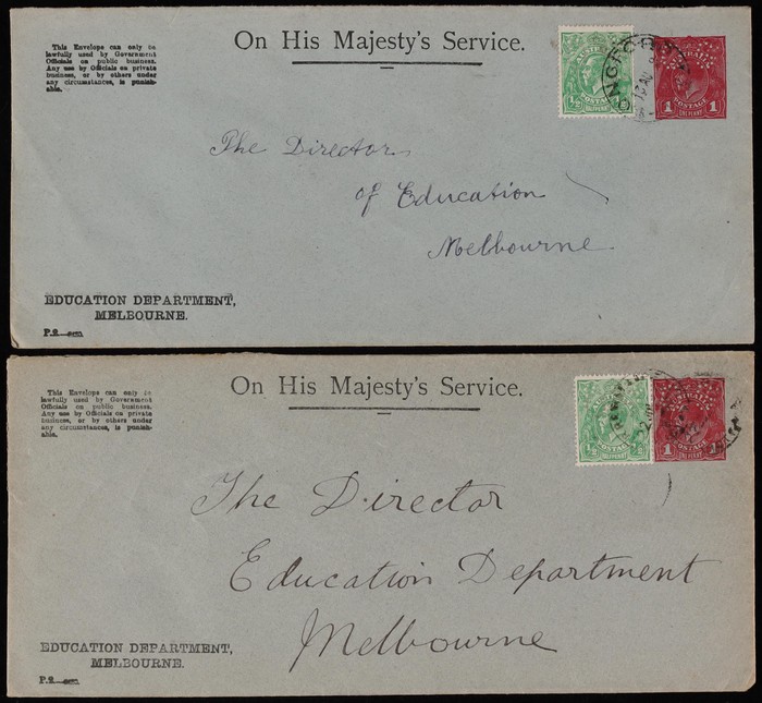 Official envelopes 1914-16 long Education Dept Victoria 1d red KGV type I OS die (ACSC EO4) uprated for use in 1919 with ½d bluish-green perf OS, one with ½d green variety 'break left frame' (6L16) & other major variety 'retouch to