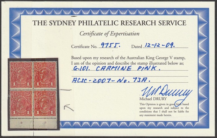 carmine-rose (G106) blk of 4 inc 6/12-6/22 ('dot before 1', 'thin left frame'). F-VF 2 MNH/2 MLH. SG 50/50c cat £396+. ACSC 74c(3)ng cat $1000 plus other stamps $1100. (4) (P) (Image1)