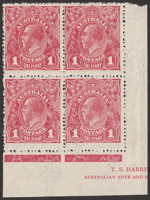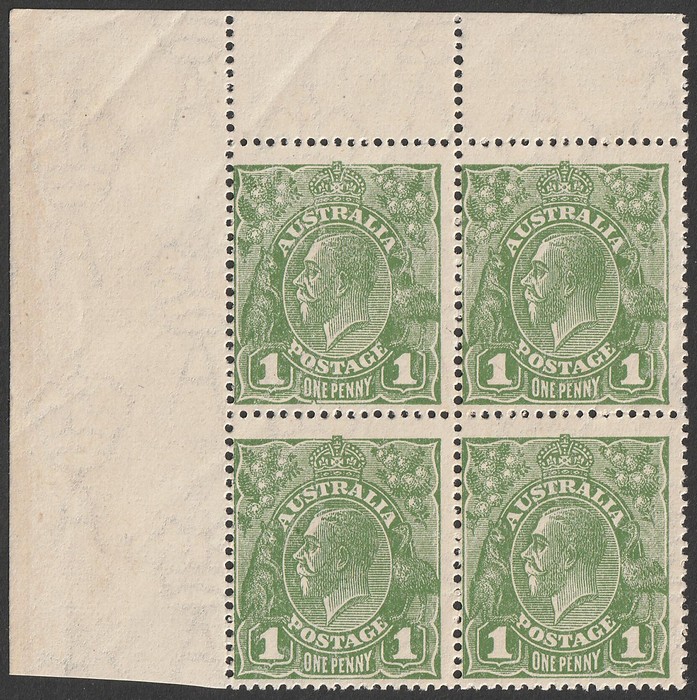 blk of 50 with varieties 'distorted One Penny' (8/13), 'thin One Penny' (8/14), 'top frame broken left of crown' (8/15), 'NY join' (8/25), 'scratch behind kangaroo' (8/32), 'kangaroo tongue out' (8/56), 'run N of One' third state, 'cnr dot' (8/54) is