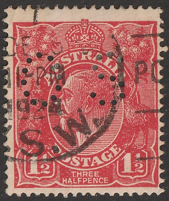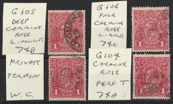 rose (G105). A FU example with Melbourne cds, pale carmine rose (G104), SG50(var), VFU, Private Perfin (WC) dated 30 Sep 20 & State perfin (Tasmania - T). F-VFU. SG50(var), ACSC 74A(var) (4) (Image1)