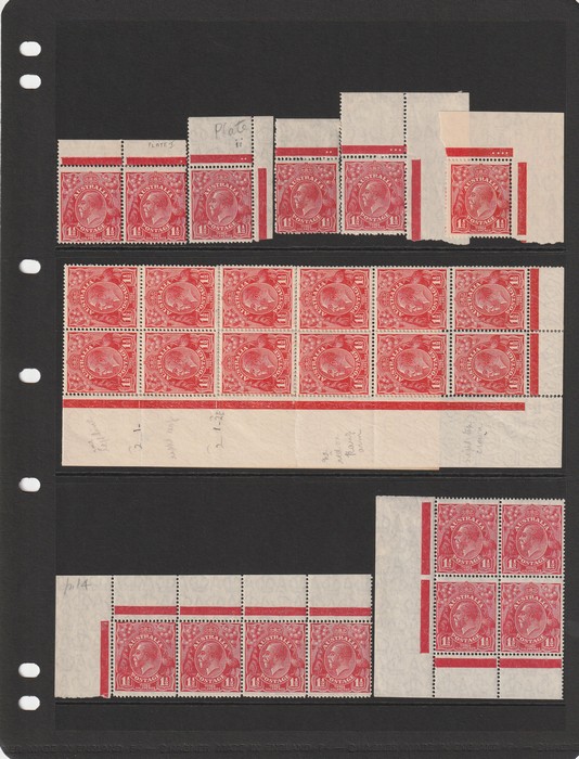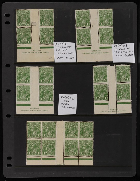 Ash imprint plate study comprising 2 blks of 8 & 6 blks of 4, identified ACSC 81(4)z Mullett imprint before retouches, scarce, has tropicalisation (cat $1500), Ash 81(4)zb 'ferns' & 'RA retouch' scarce, has a spot (cat $1000), 81(4)zd after all