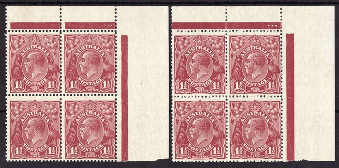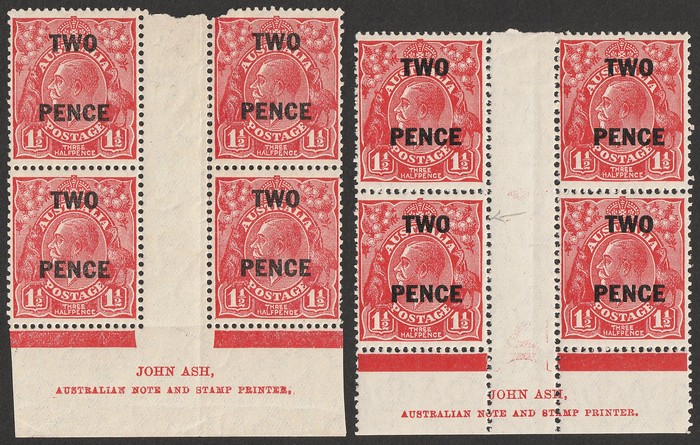 1½d golden-scarlet, plate 1, Ash imprint (N over A) blk of 4. UR stamp cnr flt & Ash imprint (N over N) blk of 4 with variety 'sliced O in Surcharge at right' (3, 4L60). F MLH. ACSC 101 (1) za & (3, 4) za cat $150. (2) (Image1)