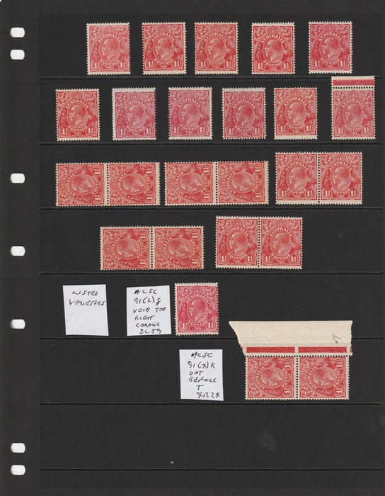 collection on hagner inc 3 commercially used part Ash imprint singles, one with Rose Bay cds, 4 listed varieties inc 'flaw left wattles' (1R19), 'vertical scratch left wattles' (2L19), 'flaw King's neck' (2R28), 'retouch shading behind kangaroo -
