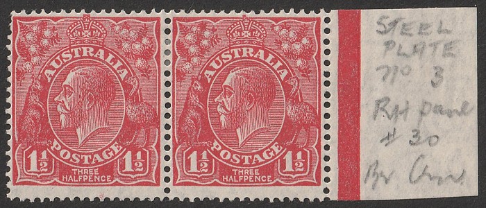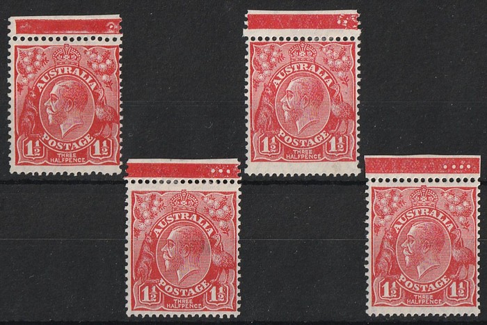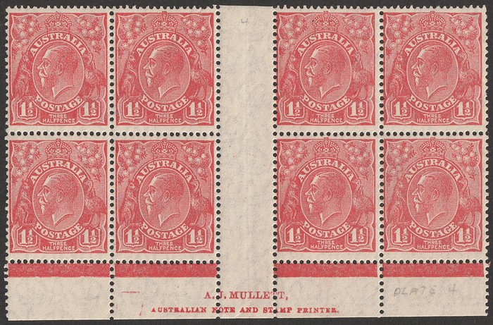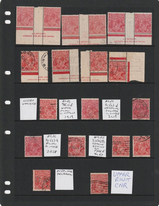 type B' (4L47), also misplaced perforation (perf OS) centred to right & part of left stamp design evident. Not listed in ACSC for this printing. Also 3 Mullett imprint prs UN with diff shades & plates. Usual condition, mostly G-FU. SG 96(var). ACSC