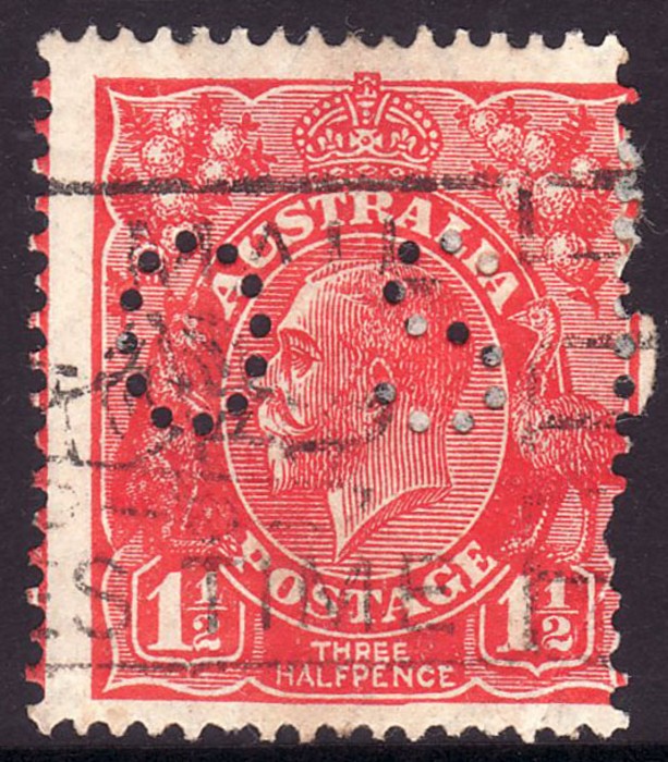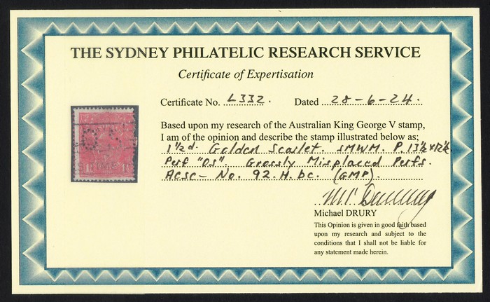 Golden-scarlet perf OS, grossly misplaced perfs, previously unrecorded. FU. SG 96(var). ACSC 92Hbc, var should be equivalent to 1½d red S wmk 89ba $250. 2024 Drury photo cert. (P) (Image1) (Image2)