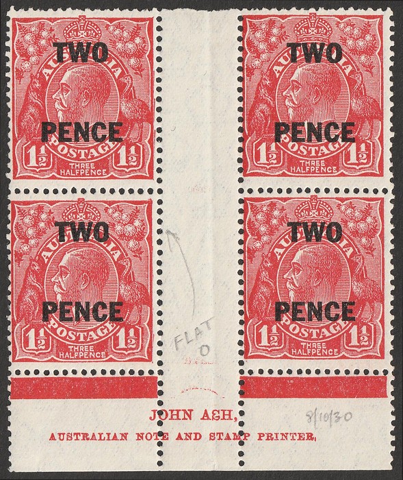 1½d Surcharge Ash imprint blk of 4 which shows 'sliced O in Surcharge' (3/4L60) so is either plate 3 or 4, this is not listed by ACSC. Fresh F MNH. SG 119(var). ACSC 101 (3) or (4) za cat $75 for M, should be at least double, $150 MNH. (4) (Image1)