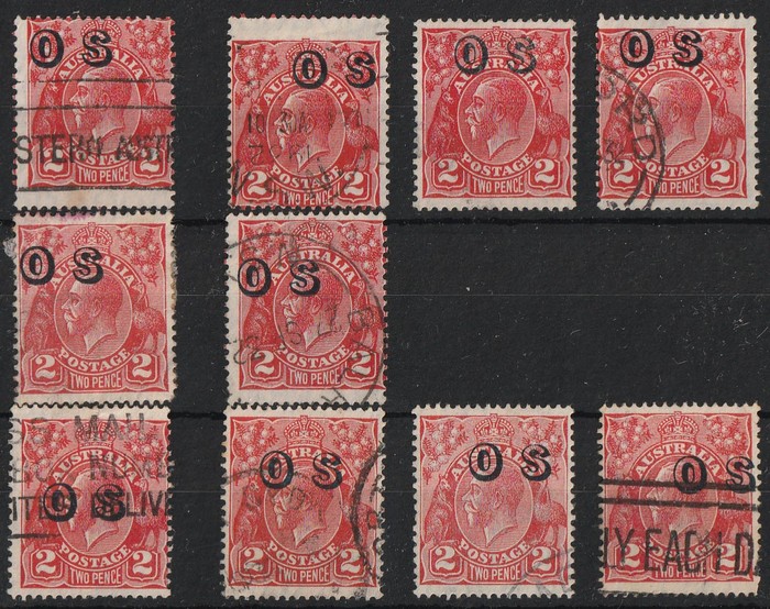 Used range showing significant variation in location of OS opt. There are 6 SM wmk perf 13½x12½, at least one of which qualifies as 'opt misplaced' (cat $200) & 4 CofA wmk. Interesting. U-FU. SG O123(var). ACSC 102 A (OS) ca & 103 (A)