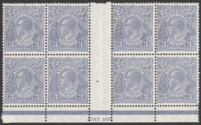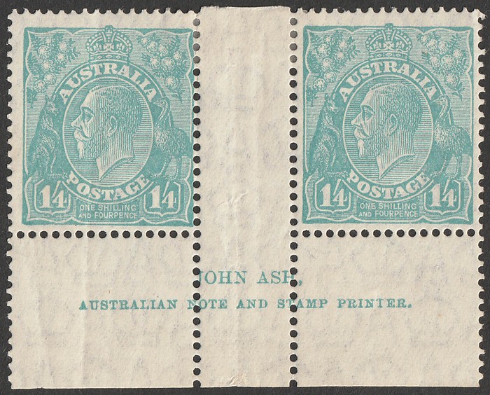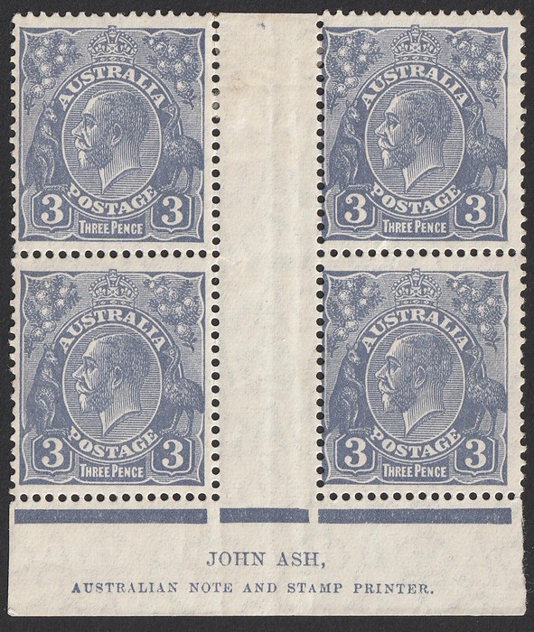 Ash imprint pr, lighter shade than normal with some duplication of imprint around Ash Australian Printer, unusual when compared to other examples. VF MNH. SG 104(var). ACSC 130Az cat $3250 for MLH imprint blk of 4, should be at least half for imprint