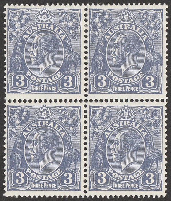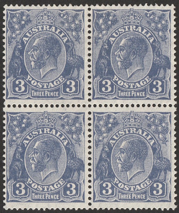 blk of 4 plated as 5R32-33, 5R38-39 with varieties 'flaws on R of Australia' (5R33) & 'retouch ST of Australia' (5R38). Good positional piece. VF fresh 2MLH/2MNH. SG 100b(var). ACSC 108Bf & g cat $240, should be at least double, MNH, var, plus other