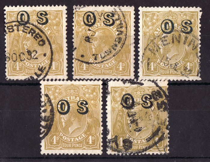 4 examples with OS opt in diff positions from top of the stamp to centre position, plus very heavy opt with duplication of the OS & likely a double opt. Interesting range. FU. SG O126, ACSC 116B(OS) cat $250 as standard OS. (5) (Image1)