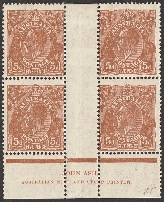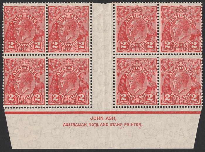 Die III John Ash imprint blk of 8 on thinner paper, unusually it shows some duplication of printing under Australia note etc. F-VF fresh 2 MLH / 6 MNH. SG 127(var). ACSC 103Bz cat $60 for Mint, should be at least double, $120 plus additional stamps.